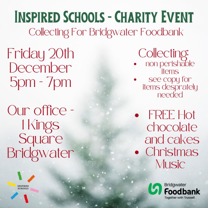 Inspired Schools in Bridgwater will be collecting donations for the Foodbank in December. So if you are a local business or just local to Bridgwater then please go along to support the event, the more they can collect and donate the better.